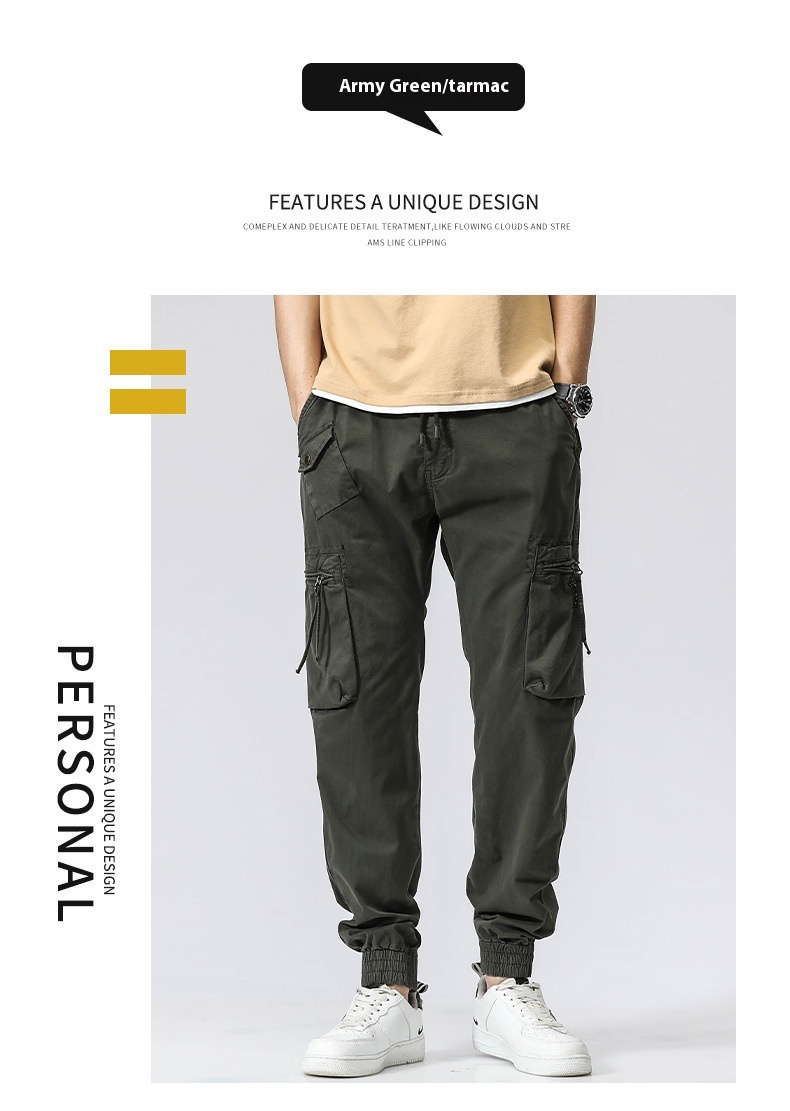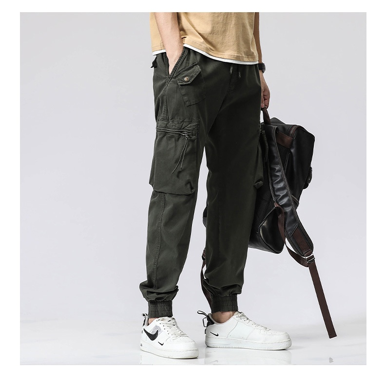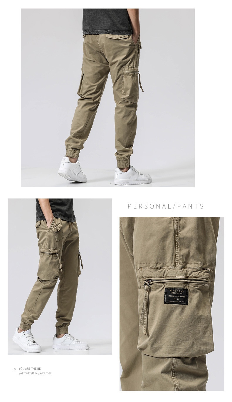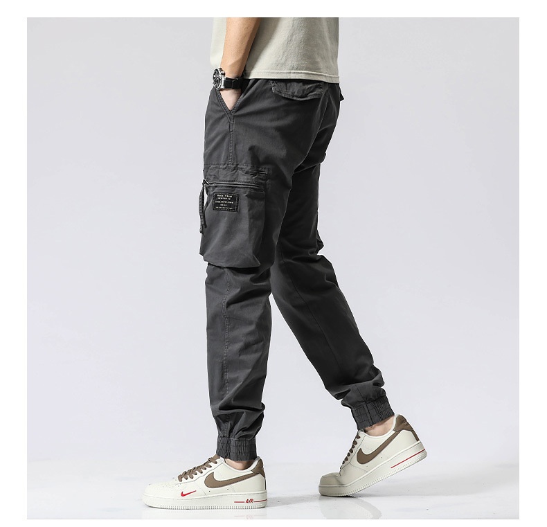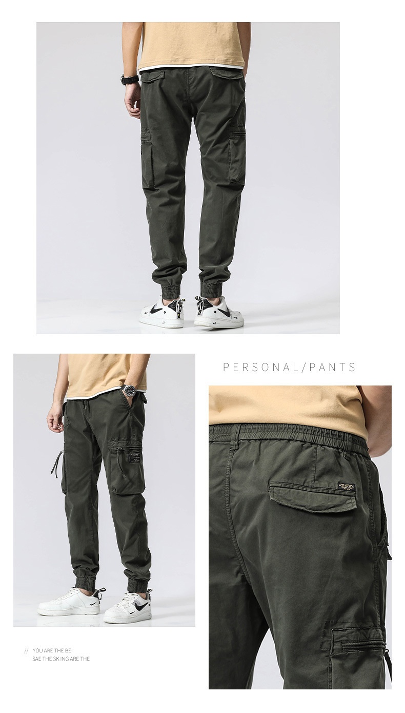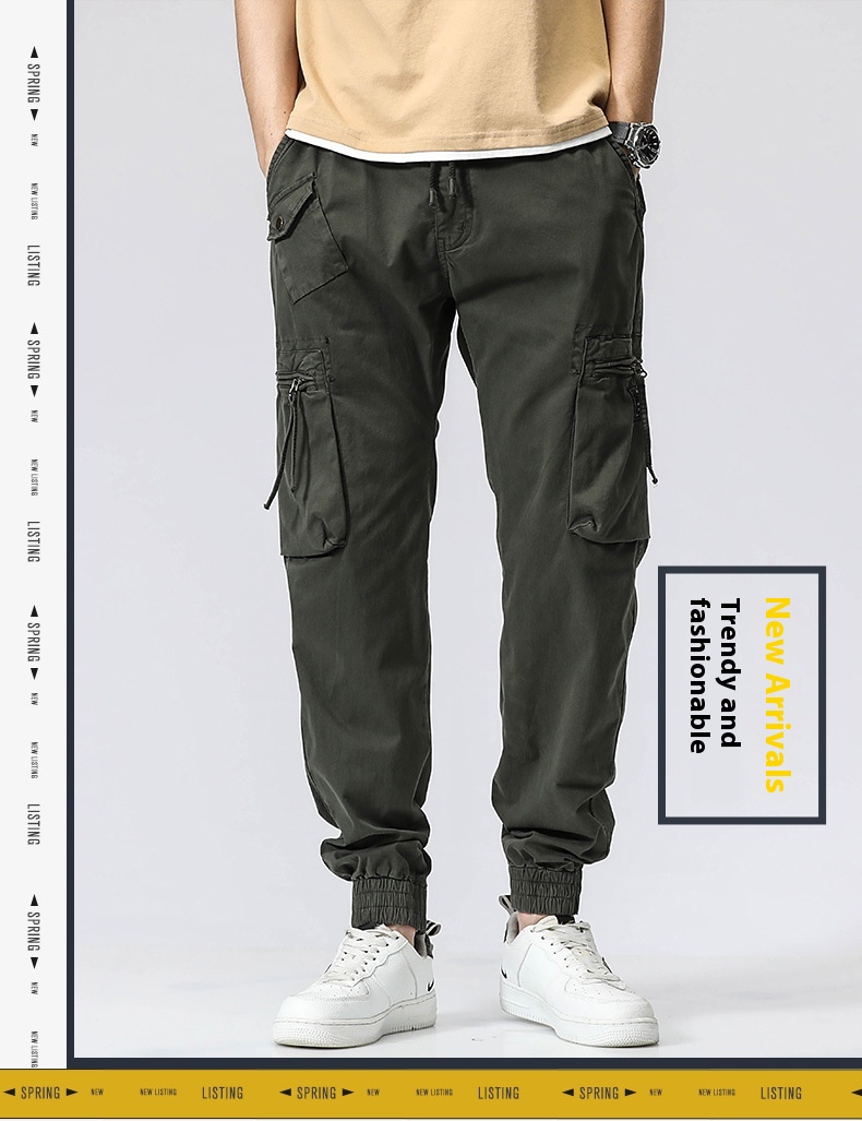 Casual Pants Trendy Brand Elastic Waist Men's Youth Simple Pure Cotton Multi-pocket Work Pants Trousers Ankle-tied