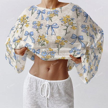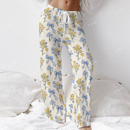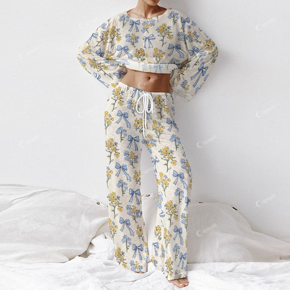 Colordate Women's Blue Bow And Yellow Flower Print Long Sleeve Cotton Homewear Set
