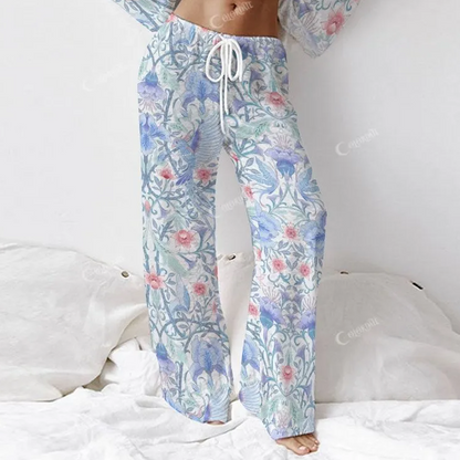 Colordate Women's Blue Flower And Bird Print Long Sleeve Cotton Homewear Set