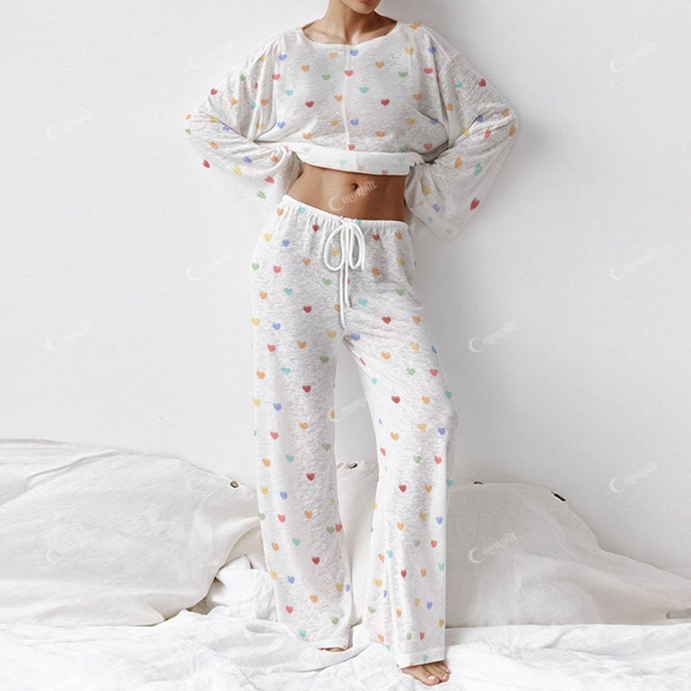 Colordate Blissful Hearts Women's Colorful Heart Print Long Sleeve Cotton Homewear Set