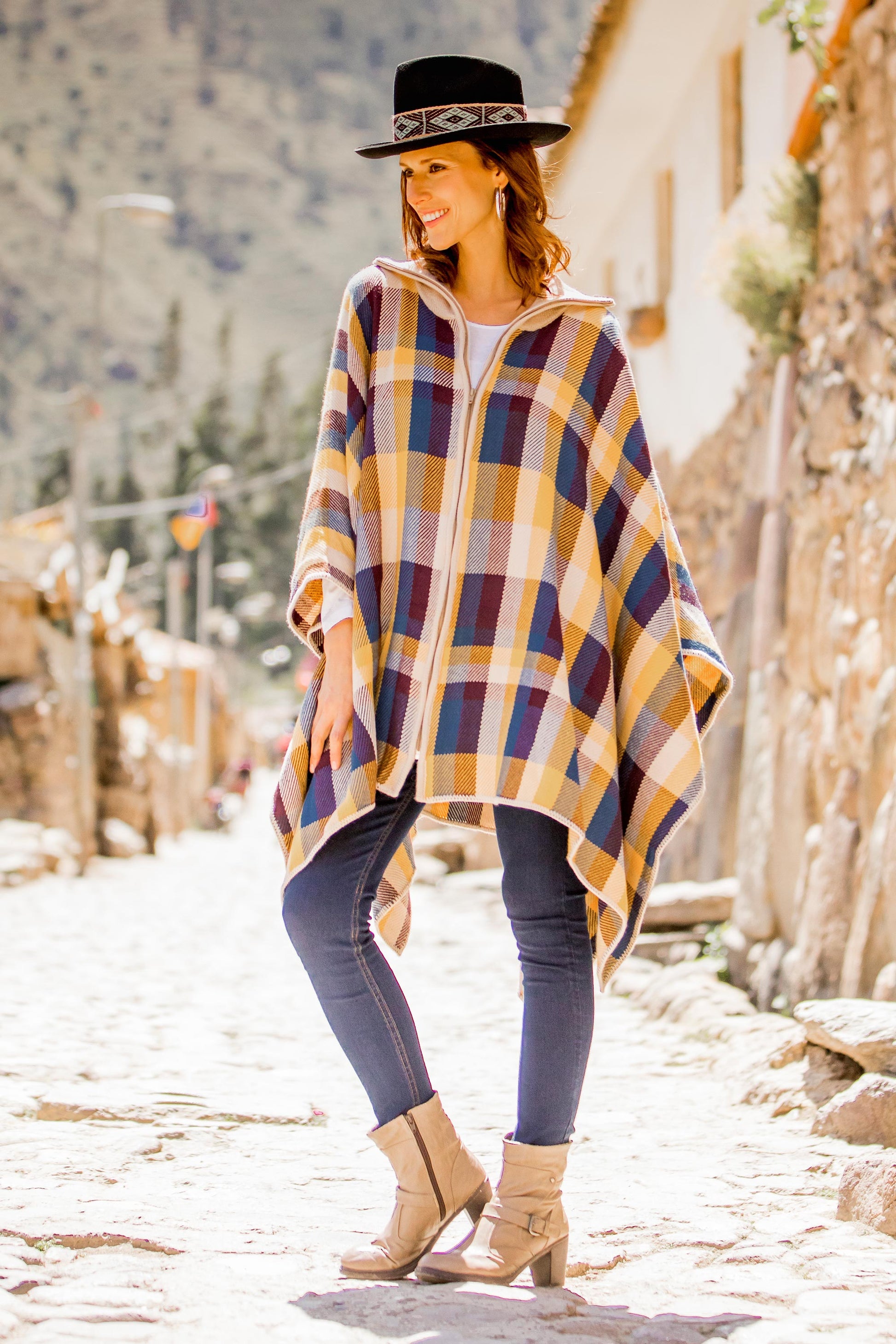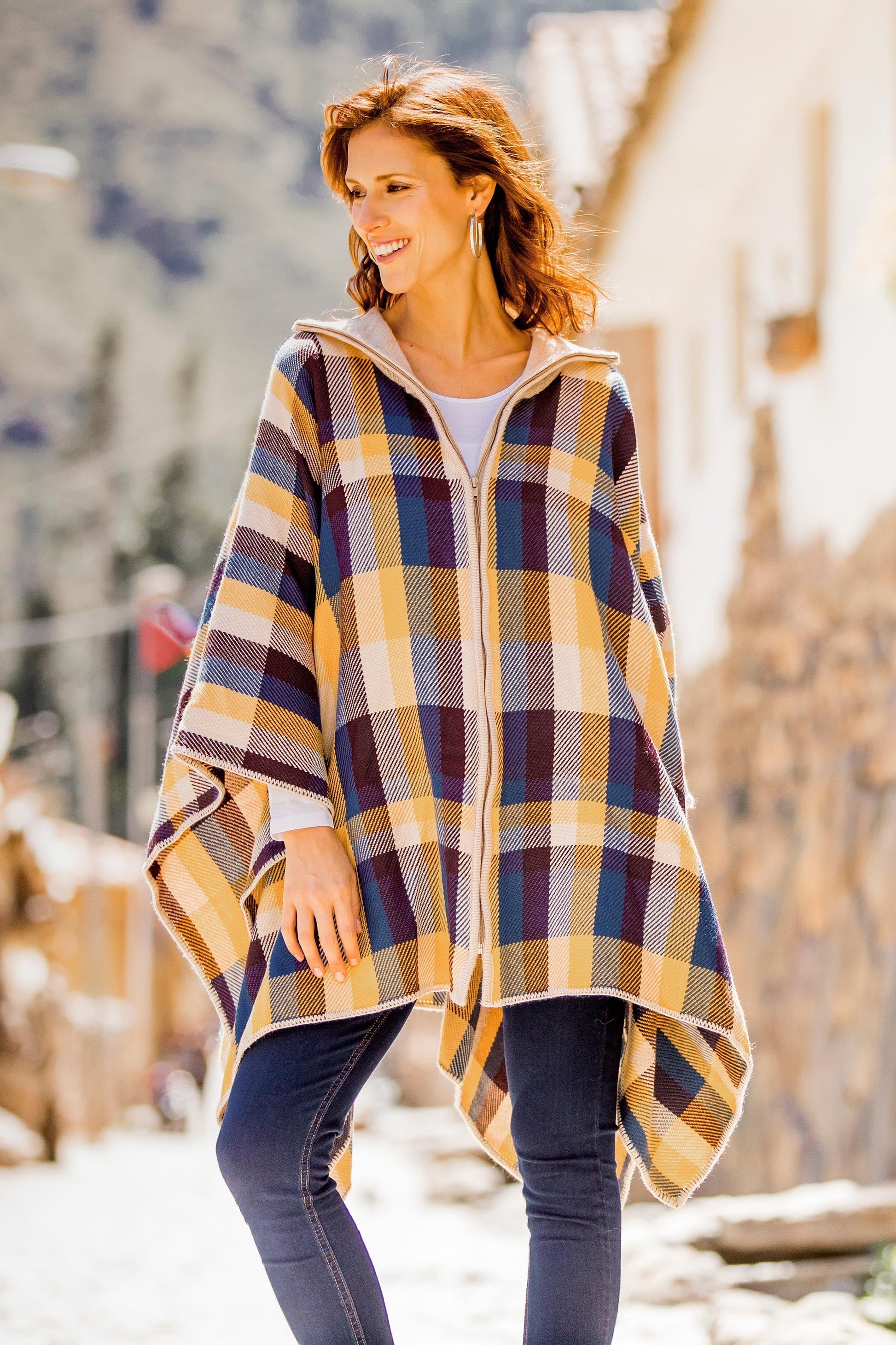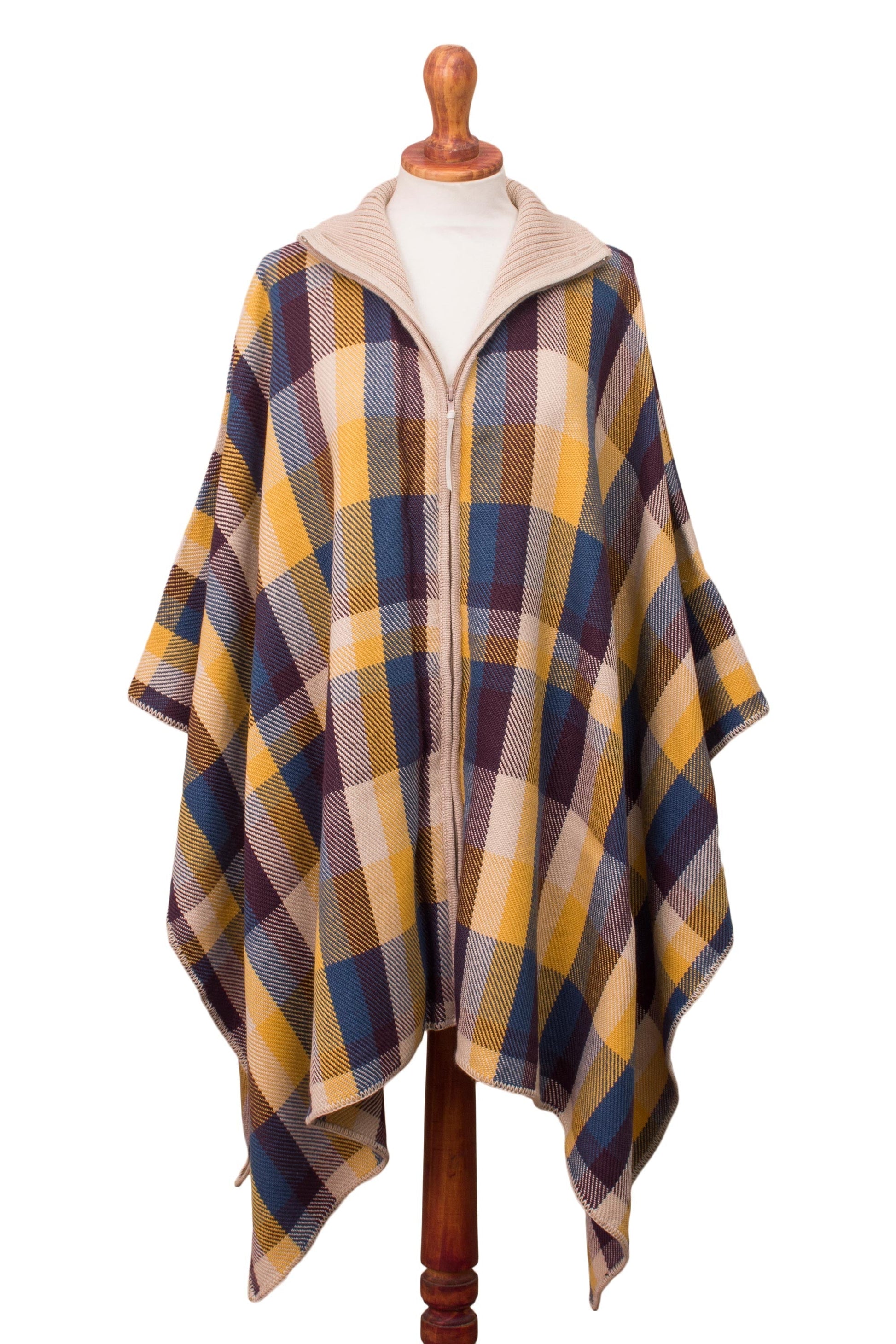 Decorated with checked patterns of taupe, saffron, maroon, and indigo, this poncho from Peru is woven from a sumptuously soft alpaca blend. Nestor Yana creates this bright cape, which features a shawl collar with a zip-up front.