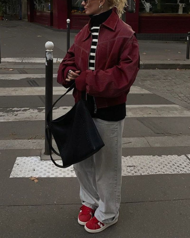 The TAYLA jacket is a bold and modern take on the classic leather jacket, with an oversized silhouette perfect for contemporary streetwear looks. Its striking design features prominent stitch detailing that accentuates the structure, while the deep red color brings a pop of sophistication.