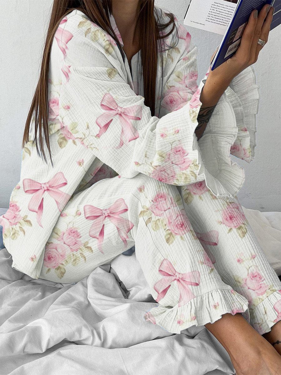 Women's Bow Rose Pattern Ruffled Long Sleeve Pants Set