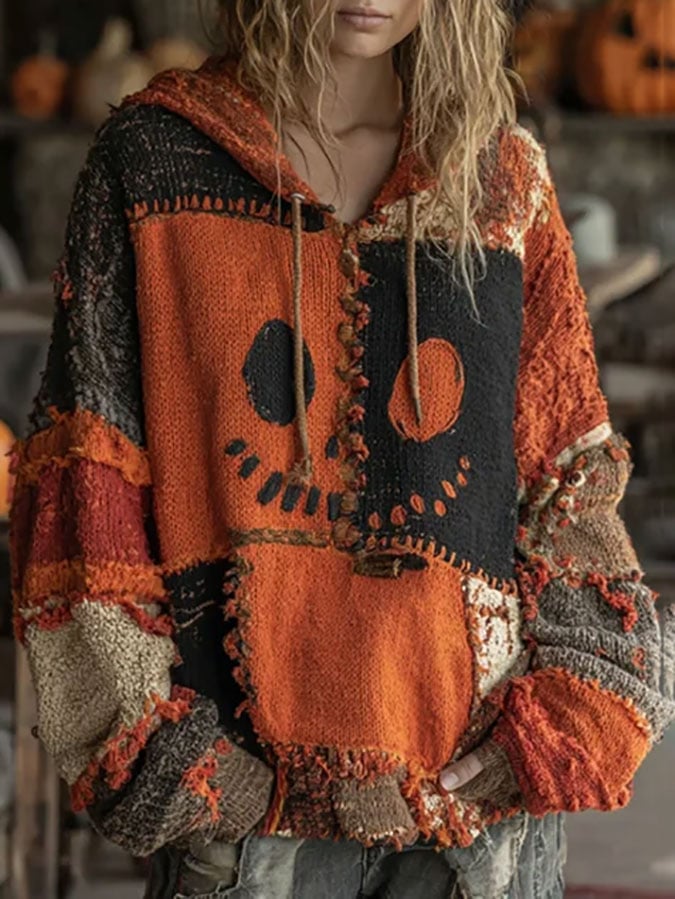 Women'S Halloween Spooky Face Patchwork Print Hoodie