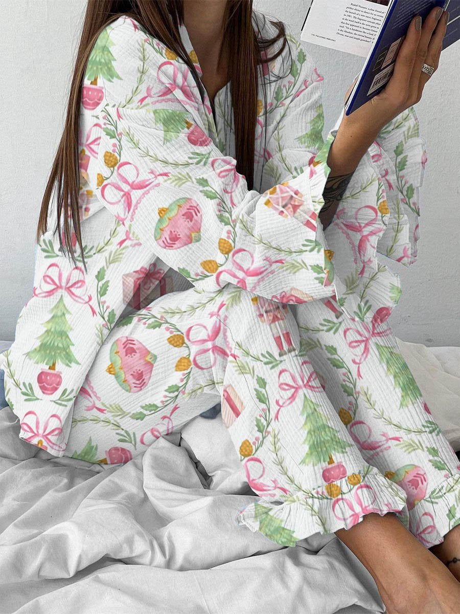 Women's Christmas Pink Bow Nutcracker Print Linen Cotton Suit