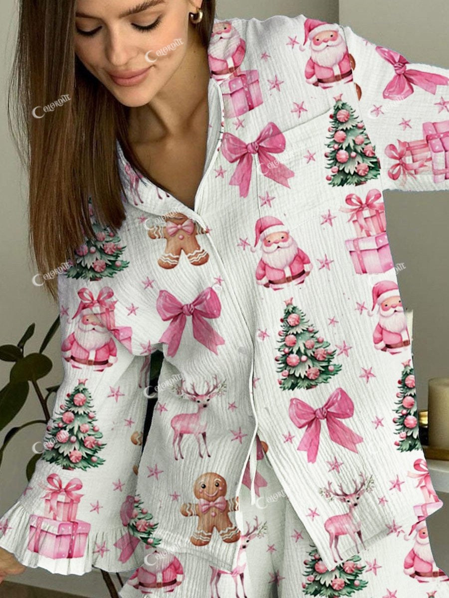 Women's Pink Christmas Bow Printed Long Sleeve Home Suit
