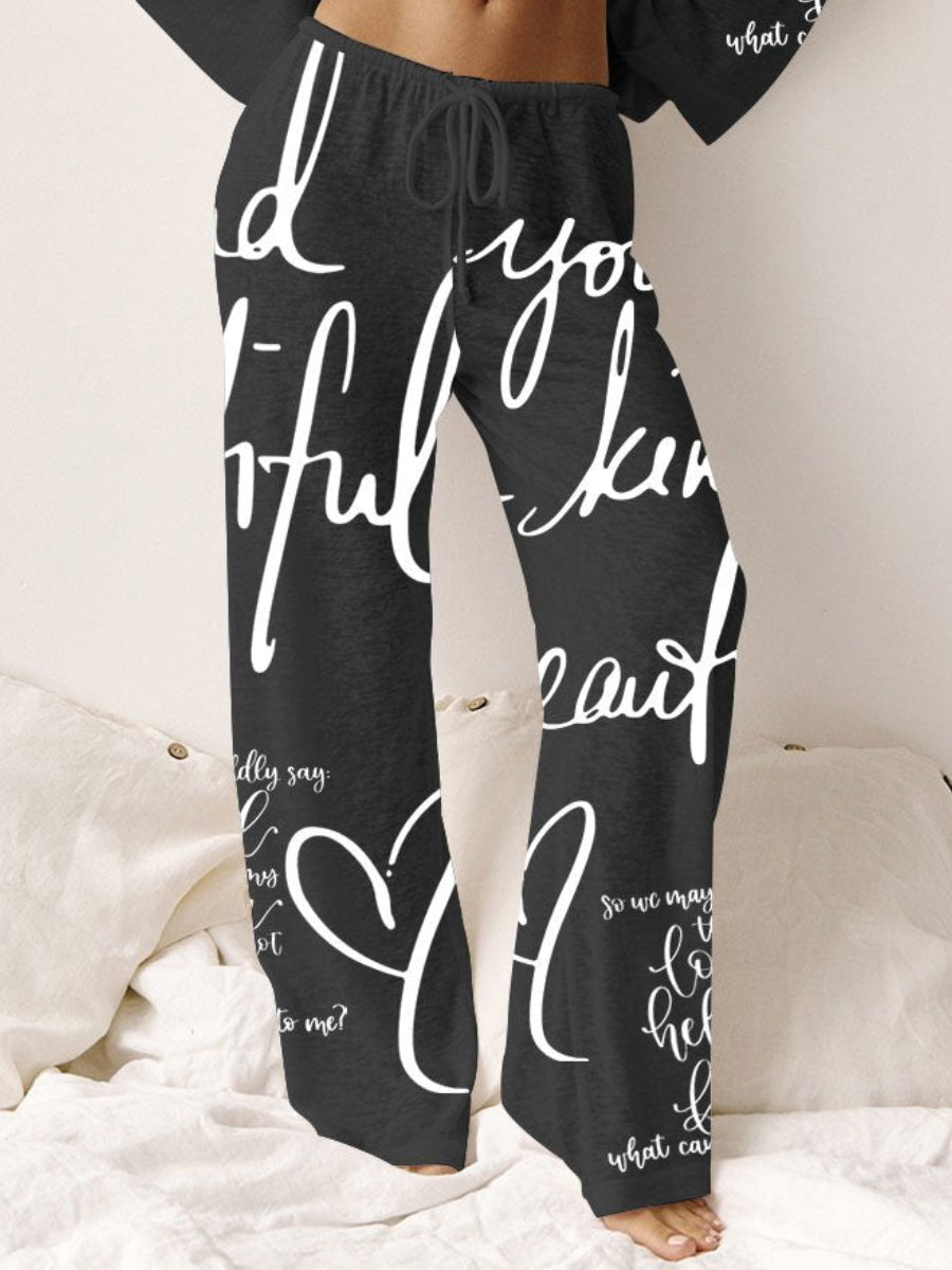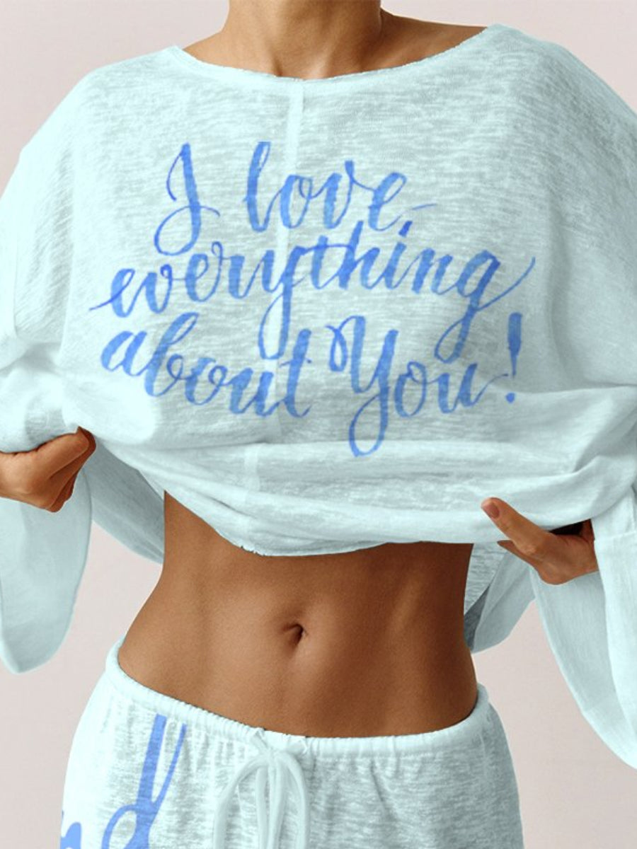 Wrap yourself in a whispered confession of love with this effortlessly chic pajama set, crafted from featherlight blended cotton that caresses your skin like a tender sigh. Delicate cursive script dances across the fabric—'I love everything about you'—each letter flowing like ink spilled from the heart, a secret love note meant to be worn close. The whisper-soft fabric carries these sweet declarations like a summer breeze carrying petals, as if the very threads are woven with adoration.